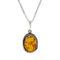 This unique Amber pendant features sterling silver set in a decretive design. The pendant comes with an 18" sterling silver curb chain.