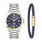 Mens Boss watch and bracelet gift set. Boss strike watch 1514301 features a brushed and polished finish stainless steel case, with a gold plated fixed bezel, a blue textured dial, and a date window positioned at 3 o'clock. Complimented with a brushed and polished stainless steel bracelet, that fastens with a push button deployment clasp.