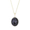 9ct yellow gold Derbyshire Blue John double sided pendant. Beautifully hand crafted in Sheffield, England. In an oval shape, and set with a unique piece of Derbyshire Blue John and tigers eye. Set on a 20" gold plated sterling silver belcher chain.