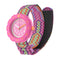 Timex T89001 time teacher children's watch has a round purple plastic case and a white colour full figure dial with pink numbers, a blue hour hand, pink minute hand and a pretty butterfly ticking as a seconds hand.