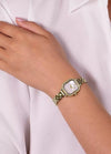 This elegant ladies watch features a cushion shaped case in polished pale gold plating. The mother of pearl dial with a rainbow effect creates a luminous backdrop that shifts beautifully in the light, beautifully framed by a clear stone-set case for a touch of subtle sparkle.