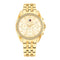 Shop ladies Tommy Hilfiger Mellie watch. Featuring a round crystal set gold plated stainless steel case, with a satin finish gold dial. This watch is fitted with a gold plated stainless steel link bracelet, that fastens with a push deployment fold over clasp.