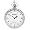 The back of this pocket watch has a brushed finish and features a large round viewing window to the mechanical movement.