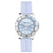 The blue silicone strap measures 22mm wide and fastens with a steel buckle.