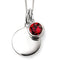 Sterling silver necklace holding two pendants; a round polished silver disc and a dark red colour Swarovski crystal pendant to match the January Garnet birthstone.