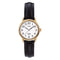 Timex Indiglo easy reader ladies watch has a round gold plated polished case with a stainless steel case back and a white colour dial. The dial features black numbered hour markers with black hour and minute hands and a gold colour seconds hand. A date window is positioned at 3 o'clock and the Indiglo light feature is activated by pressing in the crown.