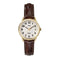 Timex indiglo easy reader ladies watch has a round gold plated polished case with a stainless steel case back and a white colour dial. The dial features black numbered hour markers with black hour and minute hands and a gold colour seconds hand.