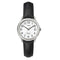 The Indiglo light feature is activated by pressing in the crown. The black leather strap measures 12mm wide and fastens with a gold plated buckle.