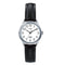 The black leather strap measures 18mm wide and fastens with a polished stainless steel buckle.