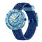 This Flik Flak watch has a quartz battery movement and is 30m water resistant.