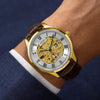 The Rotary Greenwich exemplifies the brand’s distinguished watchmaking heritage. This 42mm timepiece is encased in polished Gold PVD stainless steel and showcases a striking skeleton dial that unveils the detailed gold PVD automatic movement within.